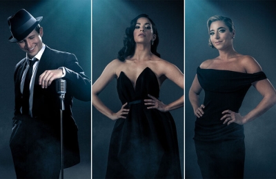 Créditos da imagem: Joel Harper-Jackson como Frank Sinatra, Ana Villafañe como Ava Gardner e Phoebe Panaretos como Nancy Sinatra em Sinatra The Musical. Divulgação / Sinatra The Musical